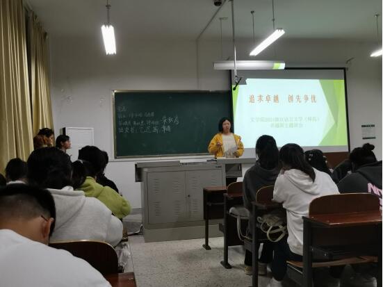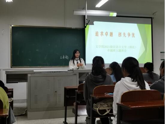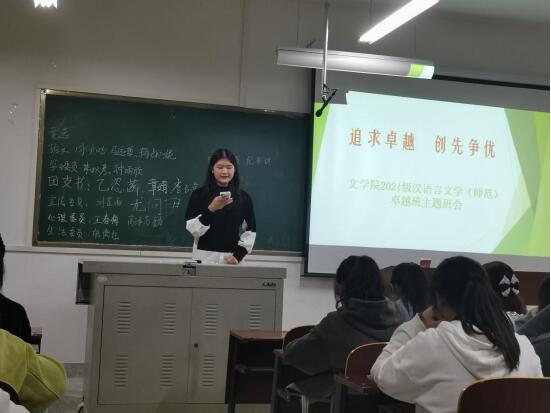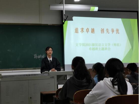 新环境、新气象、新作为。在公司周密部署、精心组织下,william威廉2021级汉语言文学卓越师范班经过笔试、面试等选拔环节,有47名来自全校2021级文科专业的同学脱颖而出,成为其中一员。为了使同学们更快熟悉新环境、融入新集体,10月28日晚,2021级汉语言文学卓越师范班在特教楼C301举办“追求卓越,创先争优”主题班会。本次班会由辅导员谷凤艳老师主持。