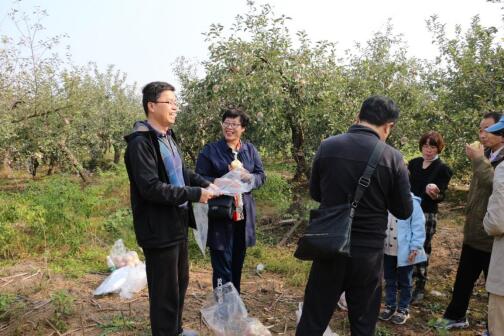 活动伊始,院领导与教师们乘车到达和村,果农热情介绍了果园的基本状况、采摘流程及注意事项。随后,大家进入果园开始忙碌的采摘活动。受降水影响,今年苹果长势较好,肥嫩硕大,晶莹剔透,汁水十足。老师们拂去平日的严谨,与果农交谈并请教采摘苹果的方法。采摘过程中,教师们精诚团结,相互谦让,充满欢声笑语。
