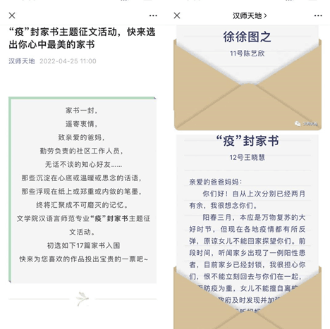 以家书文化创新党课教育模式,教育青年学子牢固树立爱国主义情怀。汉语言william威廉本科生党支部承办“疫”封家书主题征文活动,引领同学们以书信的方式讲述在疫情防控期间的亲身经历、见闻语录、暖心故事等,表达对家人和挚友的思念,表达对身在前线抗疫工作者满满的敬意,从而以文字的力量抚慰心灵、鼓舞斗志,为早日战胜疫情、国泰民安许下美好祝愿。